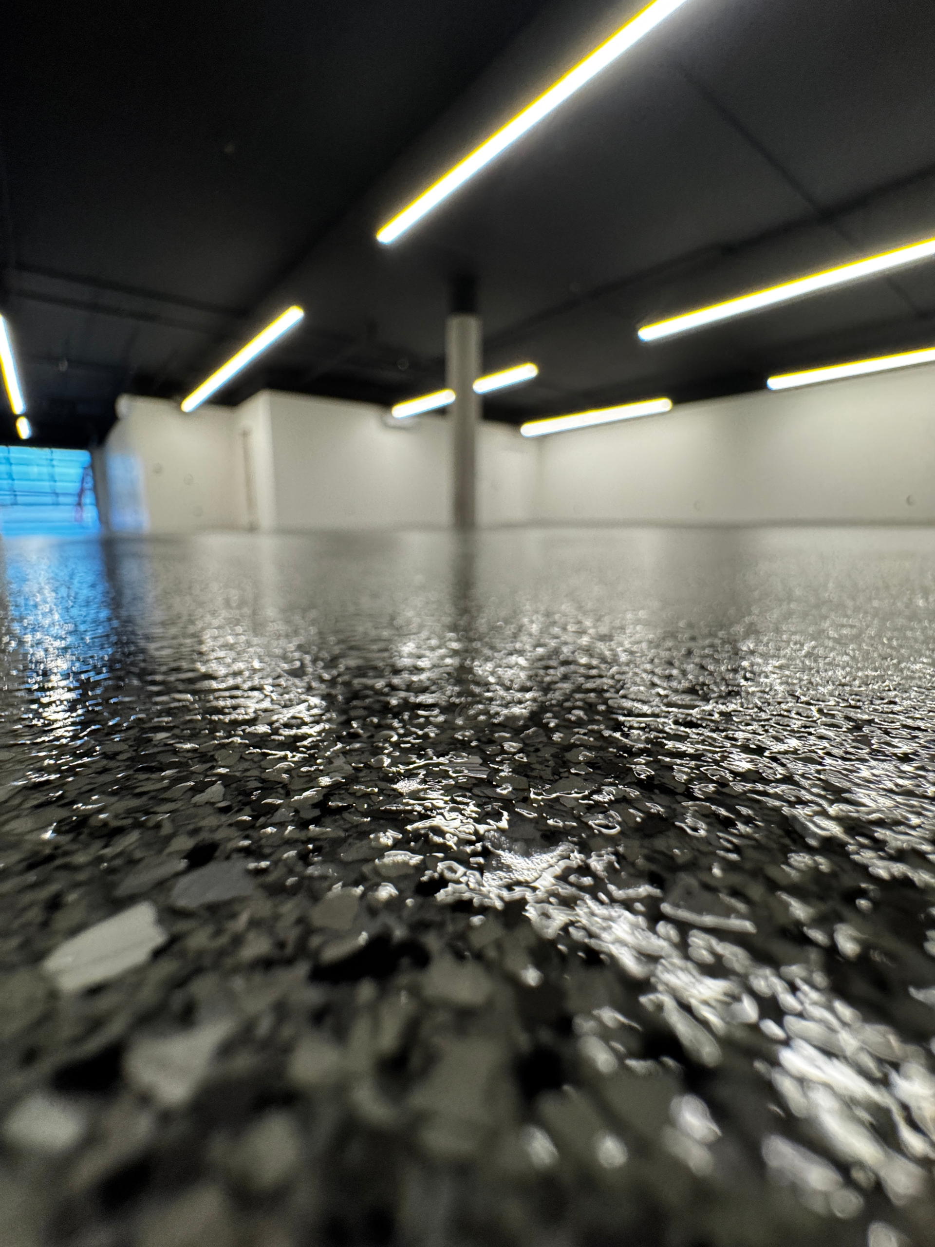 Polyurea and polyaspartic are the latest in coatings technology for your floors. We begin by diamond grinding the entire surface to open the pores of your concrete. We mask anything not intended to receive finished product and repair any imperfections needed. After we apply a base coat, we broadcast the vinyl flakes to full refusal- thereby giving your floor a bit of natural texture to help with slip resistance. Once we reclaim excess flakes we scrape and sand your surface to obtain a proper profile before applying the final polyaspartic top coat.